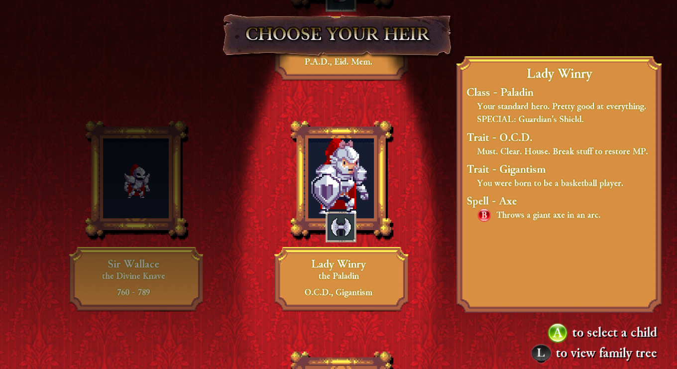 Each time you die, you return to the beginning of the game and choose a descendant of your family. The whole adventure is one long family tree of dying relatives on the same never-ending quest. I think I went through at least a hundred of them by the time I finished the first playthrough. You might be asking, “What does that have to do with anything?” The reason the descendant thing is important is that when you choose a descendant, you have to choose from 3 different candidates. They often range in various classes like Mage, Warrior, and Ninja, for example. They also have their own unique qualities that make them easier to use, more difficult to use, or just weird to use.