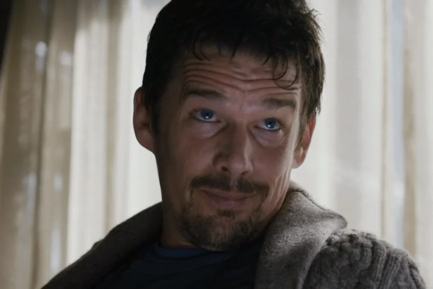 If you didn't know that Ethan Hawke's character was an author almost immediately by his cliché writer outfit (gray, unfashionable sweater; disheveled hair; glasses around his neck), don't worry, the movie will do its best to constantly remind you of the fact and further add to the cliché (smokes; drinks whiskey). There are so many camera shots of his successful book and references to his profession, that I wanted to shout: "We get it! He's a writer!"