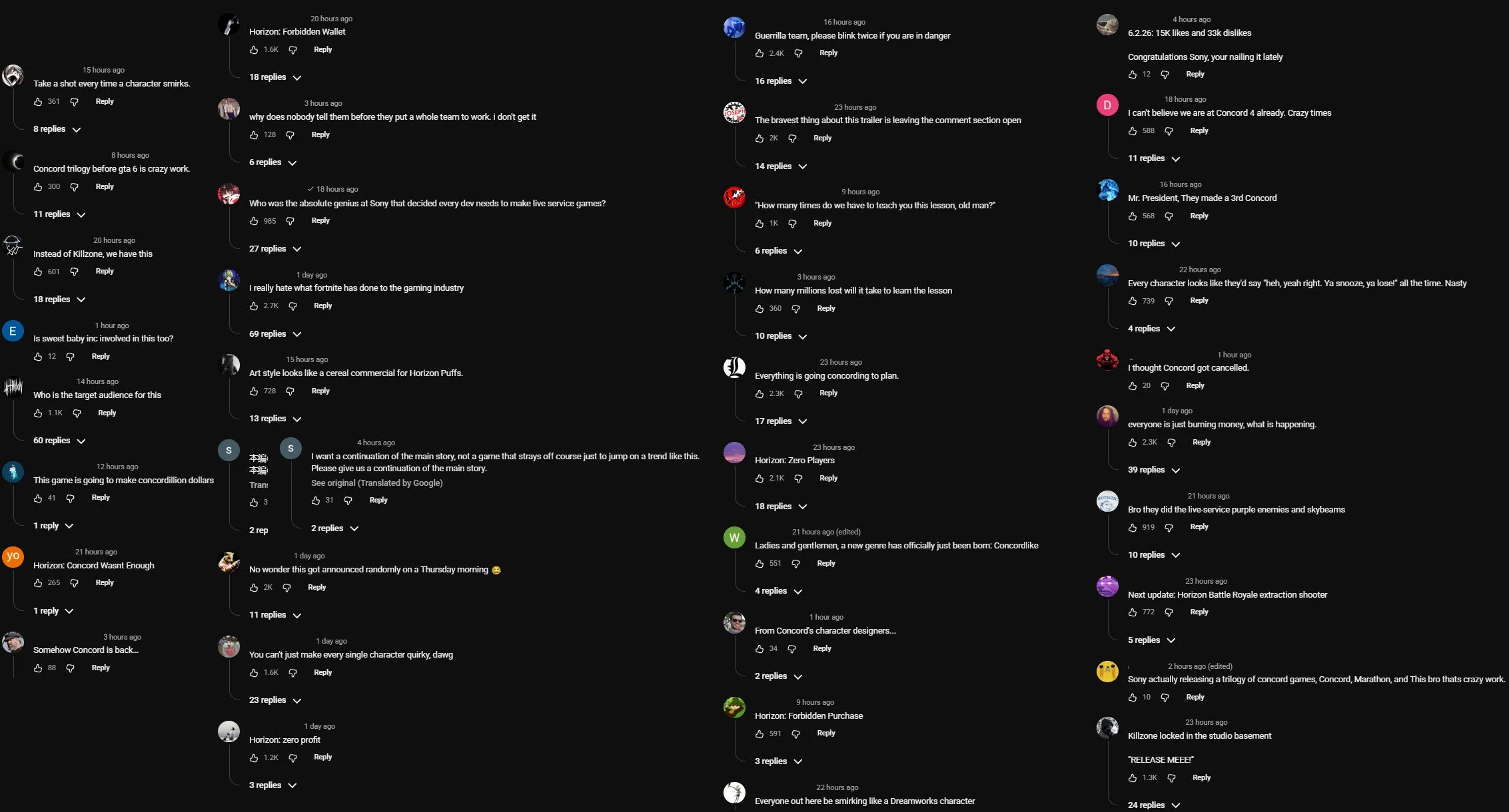 But enough about how it doesn’t look like a Horizon game. Looks are only skin deep, right? Well, not with video games as I’ve already discussed, but maybe the gameplay is good, right? Concord, Star Wars: Outlaws, and Highguard have been defended as somewhat fun by those who played them, but they still crashed and burned. If your aesthetics are going to immediately rub fans the wrong way, your gameplay has to be amazing and exactly what they want to make up for it. What the developers showed off in their trailer could be fun, but it wasn’t exactly showcasing something we haven’t seen before. It mostly looks like a cartoonish rip-off of Monster Hunter and Fortnite. Unfortunately for Guerilla, what they’ve shown so far hasn’t made Horizon fans excited. I mean, look at the comments for the trailer.