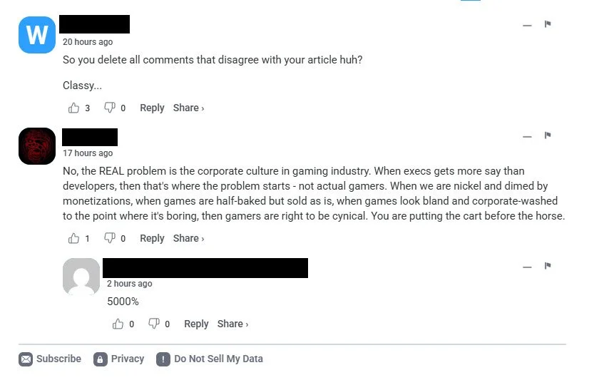 “Unless gamers recognize their role in shaping this negative culture, the cycle of hate will continue.” I will say it again. Developers and publishers have a role in shaping the culture just as their customers do. They are not devoid of blame in this situation, and they should take accountability for the industry they have shaped as a result of their actions over the past few decades. Yes, there are certainly the bad apple customers out there who are needlessly cruel and angry, but a vast majority just want games to be a fun escape from reality. Calling customers toxic bigots for not liking the choices companies make to appeal to a nonexistent audience and blaming the customer for why games fail is only going to make things worse for them.